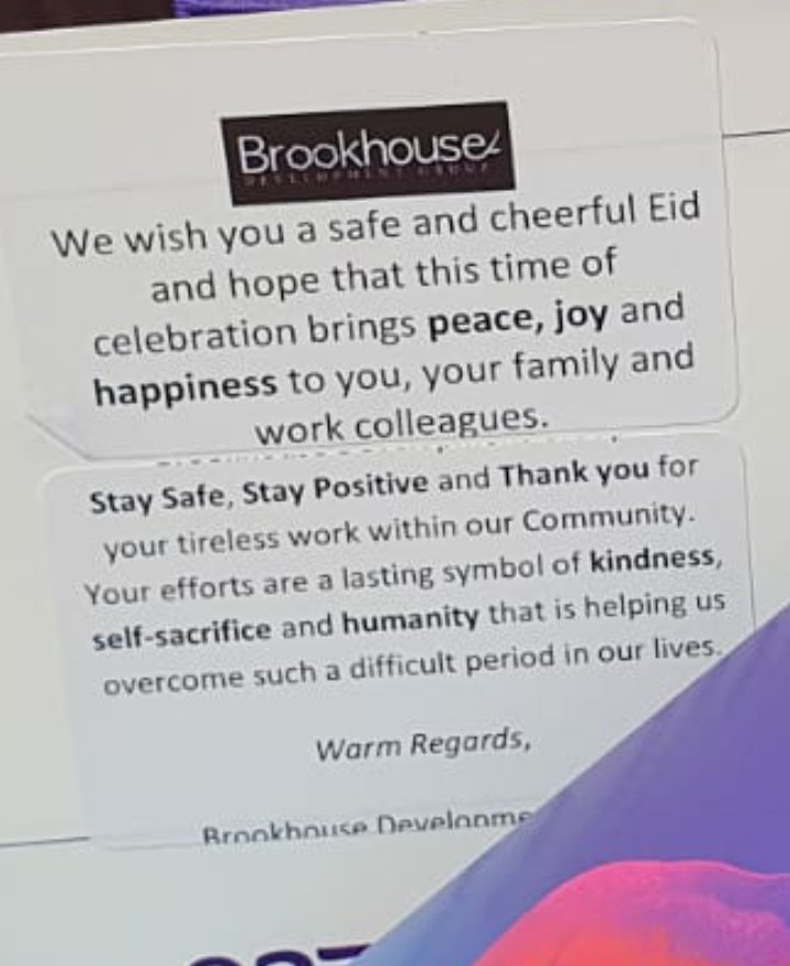 At Brookhouse Development Group, we wanted to share our happiness with others during this time. In particular, our Key Workers who have been struggling to combat the implications of the current world pandemic. As our previous post highlights, the community has been extremely generous in donating cash, food and other items for the Key Workers’ Khidmat. Without their support, we would not be able to support our Key Workers in this way.