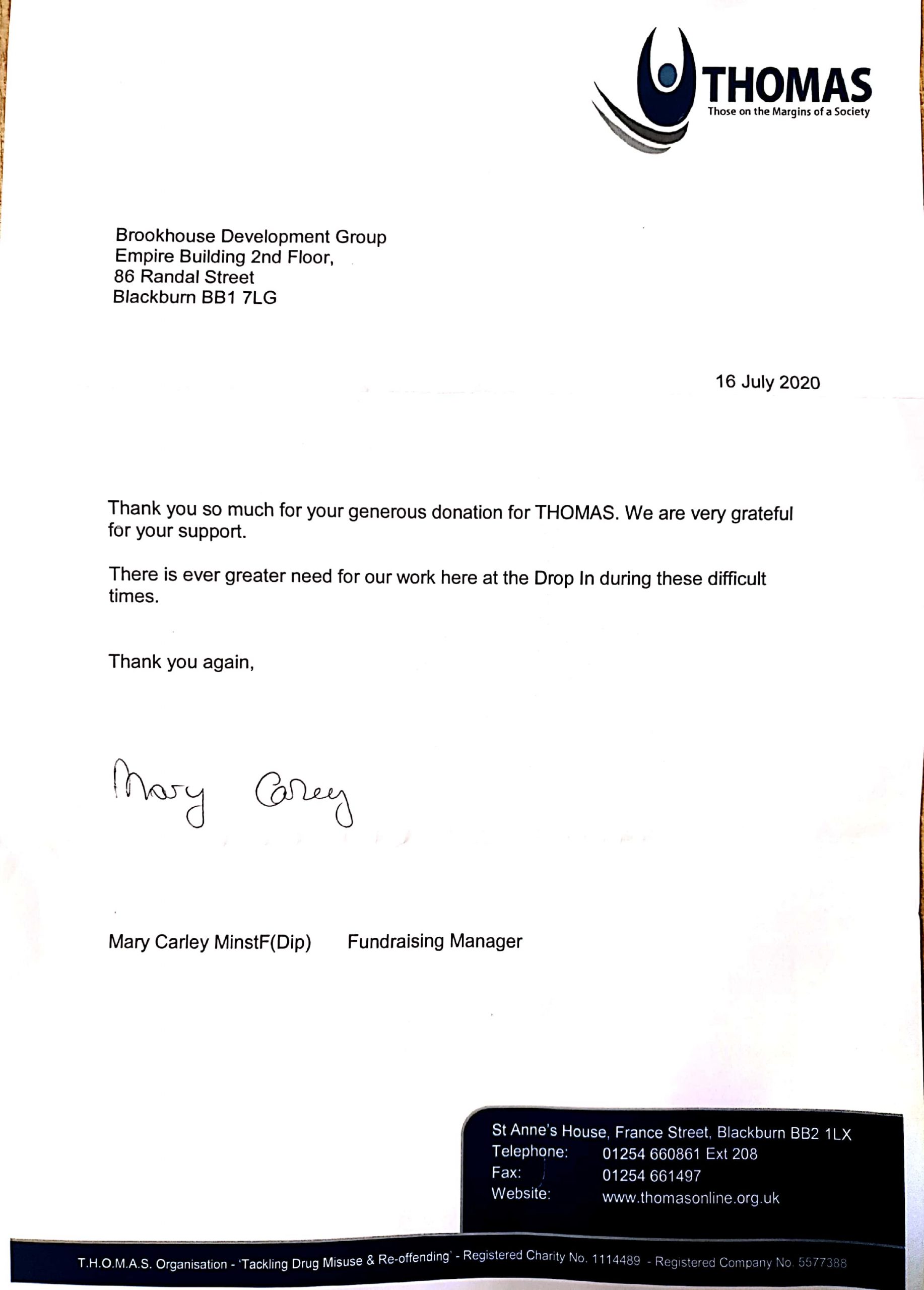 Home General Testimonials General Testimonials By BrookHouse Development Group - A collection of letters of thanks and endorsement from organisations that we have supported or worked with in the past. T.H.O.M.A.S (Those On the Margins of A Society) Derian House Children’s Hospice